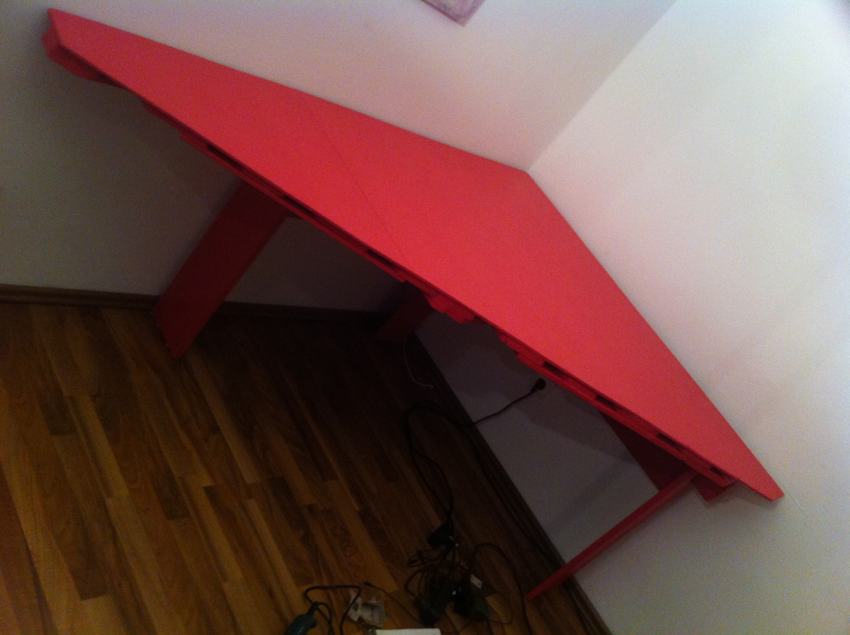 Danebenstellen und alles pink anstreichen. Palettentischplatte umdrehen, Sperrholzplatte auflegen, notwendige Schnittkanten anzeichnen, sauber zusägen. Auf die Tischplatte schrauben. Anders als beim ersten dreieckigen Schreibtisch hab ich hier die günstige Sperrholzvariante gewählt – es wird eh angestrichen.