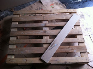 Anzeichnen des Winkels. Vor dem Absägen aber erst Brecheisenaction: eine ganze und die halbe mittlere Paletten-Unterbauverstrebung raushebeln. Nägel rausklopfen oder, wie ichs hier bevorzugte, abflexen. Alles einmal mehr schleifen.